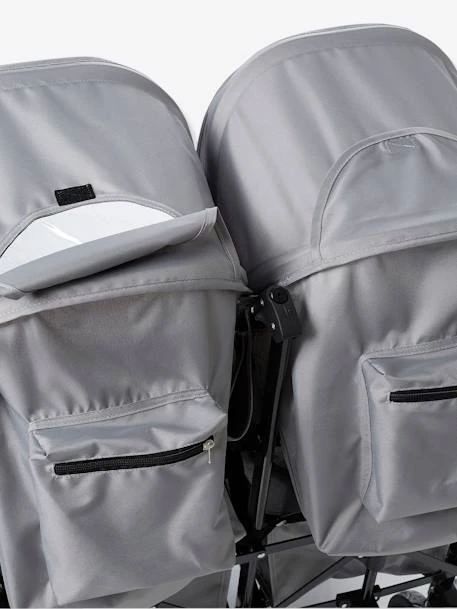 - Capotes individuelles amovibles avec chacune fenêtre de surveillance et poche zippée à l’arrière pour y glisser tout le nécessaire de bébé